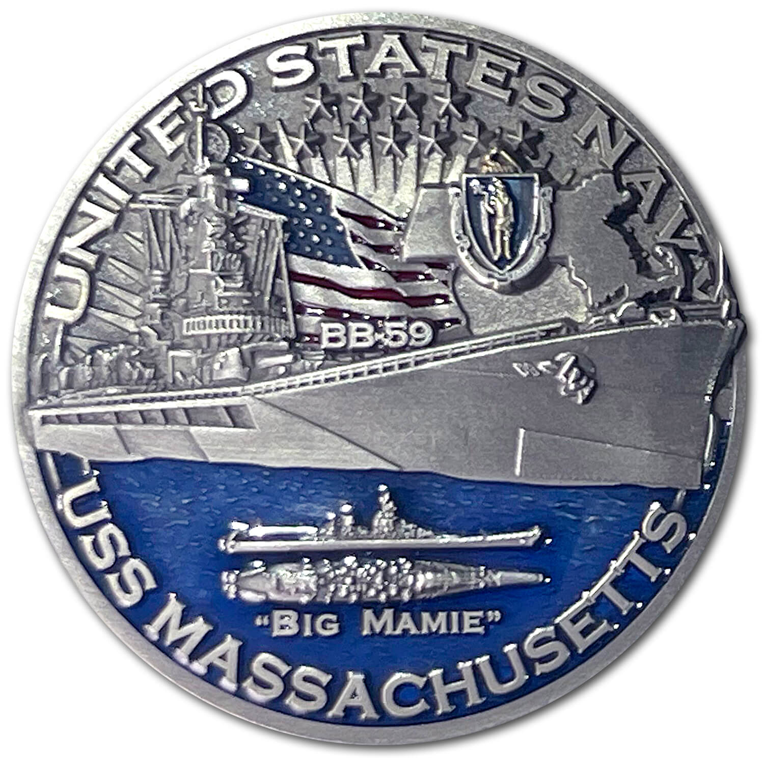 USS Massachusetts BB-59 Battleship Warships of World War 2 Collectible Military Challenge Coin was crafted with the level of detail a US Navy challenge coin deserves. Featuring the strong bow line and superstructure of this famous battleship and its detailed 3 triple 16 inch mounted guns and 20 5 inch single mount guns all displayed on this magnificent coin. The US flag in red and blue with silver accents and the great state of Massachusetts are also displayed. The nickname “Big Mamie” is also carved into the coin along with its hull number BB-59. With 9 battle stars from her actions in WW2 they are ornately displayed at the top of the coin. This South Dakota-Class battleship was involved in Operation Torch among many things in her WW2 career. She was was also designed shortly after the Washington treaty ushering in heavy 16 inch guns for most American battleships. Sun rays are seen behind the warship and a deep colorful blue sea completes the scene was designed shortly after the Washington treaty ushering in heavy 16 inch guns. A truly remarkable WW2 collectible coin this World War 2 75th commemorative anniversary coin is perfect for your collection.