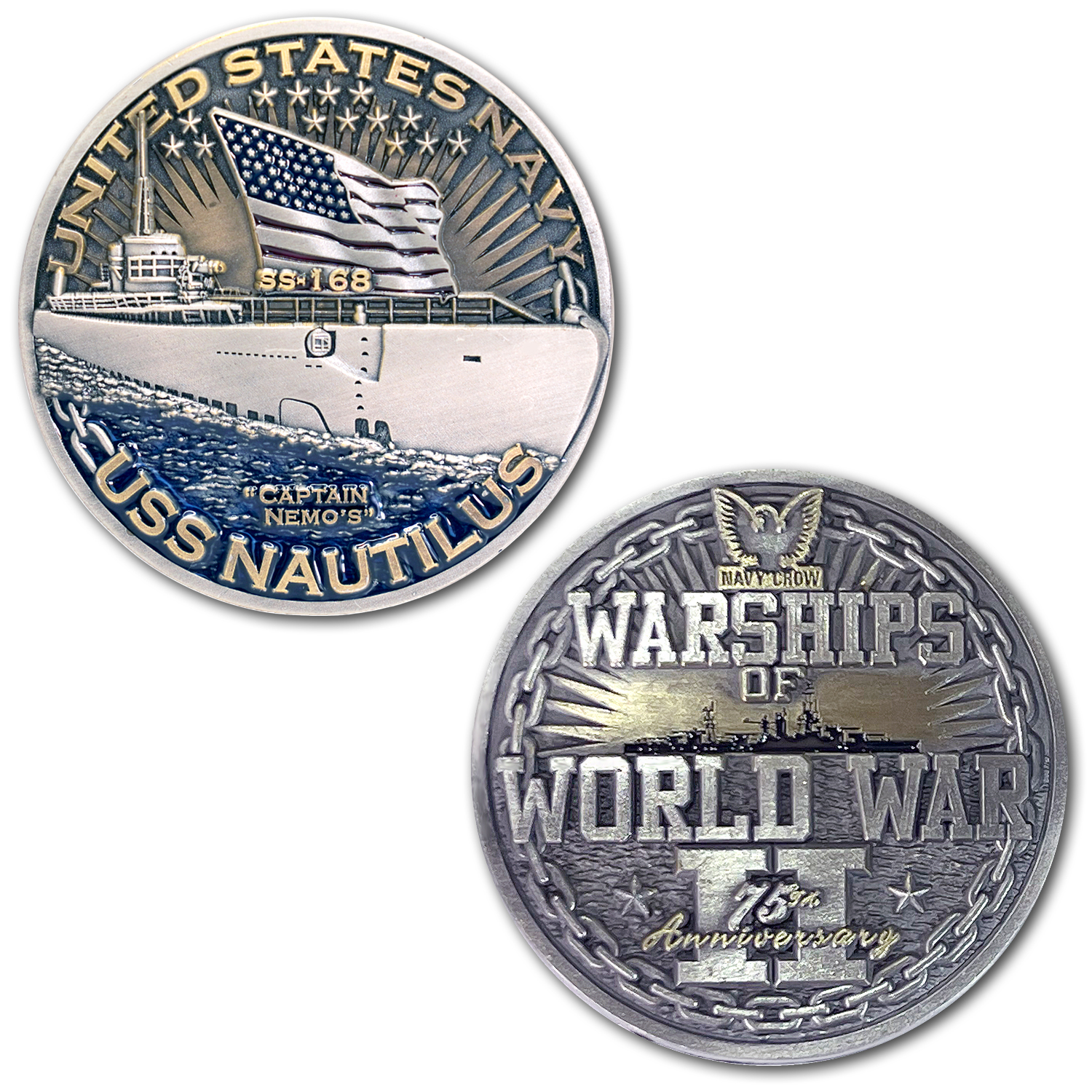 USS Nautilus Warships of World War 2 75th Anniversary Coin was created for one the largest, most powerful and the most pivotal submarines of the US Navy in World War Two. This submarine didn’t start wars. She finished them. The USS Nautilus Warships of WW2 75th Anniversary CoinUSS Nautilus Warships of World War 2 75th Anniversary Coin marks the 75th Anniversary of World War 2 with a handsome collectible coin that depicts this incredible fighting warship with the detail and originality fitting for a United States Navy coins like this. At 2 inches in size, cut to a depth of 4mm and displaying with a 3D look that is original in design the translucent paint brings additional character to a commemorative challenge coin that is perfect for your coin collection or given to a friend or shipmate.