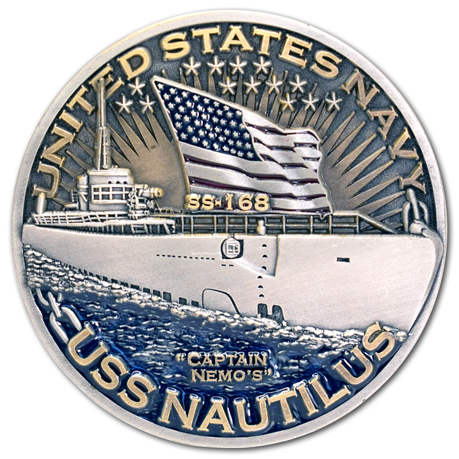 USS Nautilus SS-168 US Navy Warships of World War 2 Collectible Challenge Coin was created for one the largest, most powerful and the most pivotal submarines of the US Navy in World War Two. This submarine didn’t start wars. She finished them. The USS Nautilus Warships of WW2 75th Anniversary CoinUSS Nautilus Warships of World War 2 75th Anniversary Coin marks the 75th Anniversary of World War 2 with a handsome collectible coin that depicts this incredible fighting warship with the detail and originality fitting for a United States Navy coins like this. At 2 inches in size, cut to a depth of 4mm and displaying with a 3D look that is original in design the translucent paint brings additional character to a commemorative challenge coin that is perfect for your coin collection or given to a friend or shipmate.