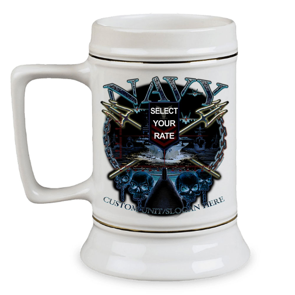 Navy Crow is presenting this US Navy Rate Navy Custom 28 oz Stein. Whether you personalize it for yourself or have it personalized for your Sailor they wont be disappointed! You can select your rate and add your unit or put a slogan on this US Navy Rate Custom Stein. Our artwork is original, but why not be able to make it your own? Here at Navy Crow, you can do that!