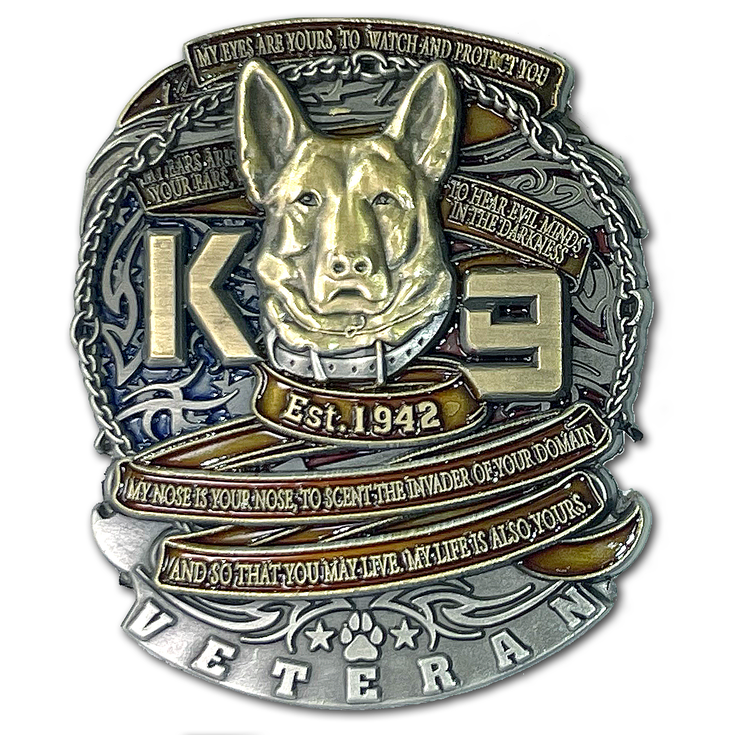 K9 Veteran Custom Engraved Coin honors the military working dogs and their human military partners. Like any other team this one is legendary with the synergy the canine and human team works to excel at when paired up. This very special coin marks the anniversary of working military dogs going back to World War 2 and 1942. Designed with a German shepherd, the letters K9, critical words from “My ears are your ears” and “To Hear Evil Minds In The Darkness” are also displayed. “My nose is your nose, to scent the invader of your domain and so that you may live, my life is also yours” is quoted as an important reminder the relationship between man and dog. This is a veteran coin for both. At the bottom are two stars one for each partner and a dog paw print. Fashioned from antique gold and silver metal accents and a deep hand painted red enamel this is a coin for collecting.