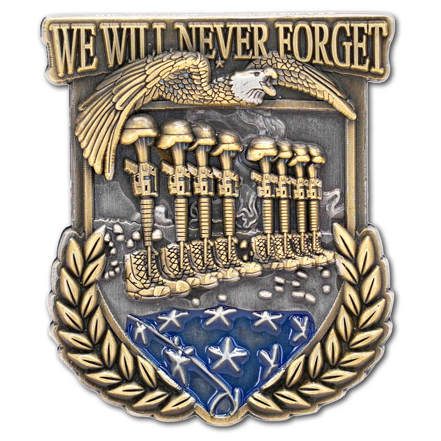 We Will Never Forget Custom Engraved US Navy Challenge Coin was crafted for our brothers and sisters in arms. This too important original design had to be made. We keep our fallen in our memories forever and this challenge coin was designed for that purpose. Seen with a battlefield cross of combat helmet, rifle and boots with the outstretched wings of an American eagle protecting our lost Soldiers. An American ceremonial triangular folded flag is seen at the bottom. The words “We Will Never Forget” are displayed at the top. The coin is made with antique gold and silver accents and hand painted blue. This is a special coin reserved for the special ceremonies.