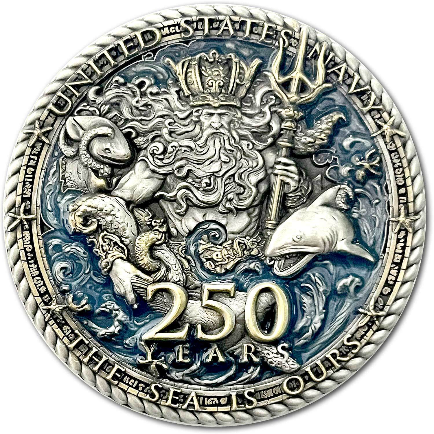 Celebrate 250 years of naval strength, honor, and tradition with this exclusive US Navy Birthday Commemorative Coin. Strikingly designed, the coin features King Neptune, the legendary ruler of the seas, wielding his mighty trident of power as he rises from the ocean depths. Surrounded by aquatic life in vivid detail, the design pays tribute to the eternal bond between the Navy and the sea.